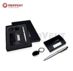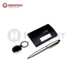Paket Souvenir 2 dari Hervent berisi 3 macam item seperti Card Holder, Pulpen Metal 24 dan Gantungan kunci bulat dengan harga yang sudah include cetak logo Grafir 1 sisi di card holder, pulpen metal dan gantungan kunci bulat nya . Paket Souvenir 2 di hervent di kemas elegan dengan Hardbox yang dilengkapi busa padat pada bagian dalamnya.